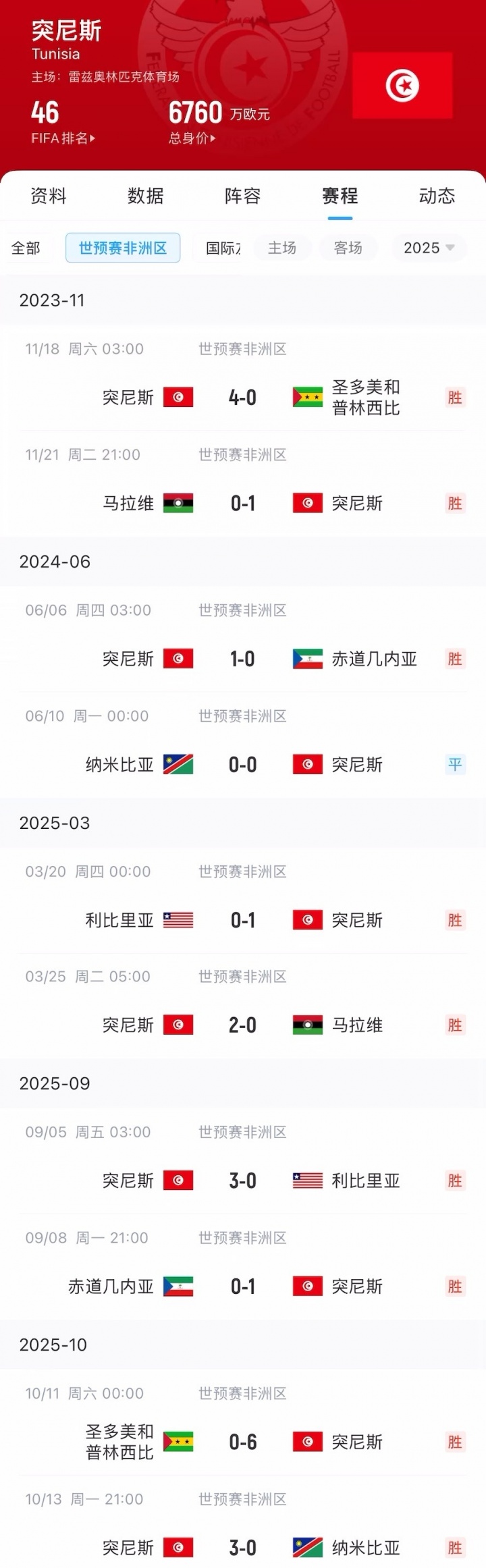 10月13日讯 世预赛非洲区小组赛H组今天结束了最后一轮的全部较量,最终突尼斯以10轮28分,进22球失0球的无解战绩小组第一收官。在本阶段世预赛中,突尼斯除了客战纳米比亚时0-0战平,其他场次全部取胜且一球未失。突尼斯早在第8轮就已经锁定小组第一提前晋级世界杯,他们是非洲区第二支晋级的队伍。