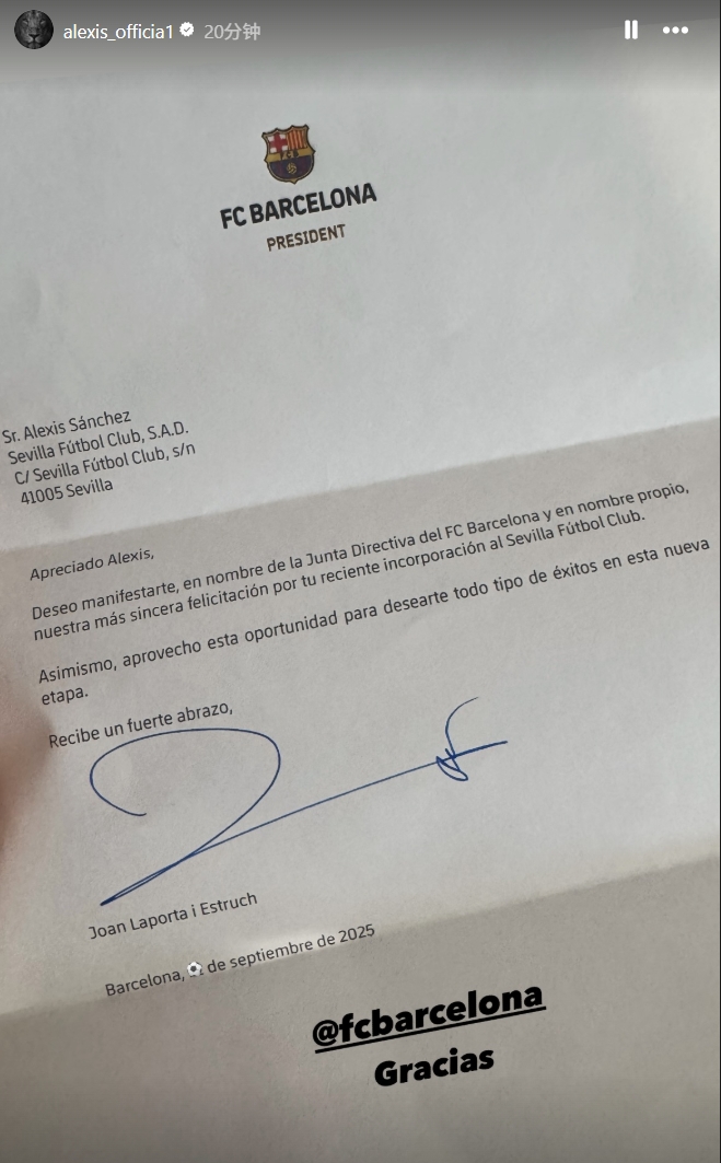 暖心!36岁桑切斯收到老东家巴萨来信:诚挚祝贺你加盟塞维利亚