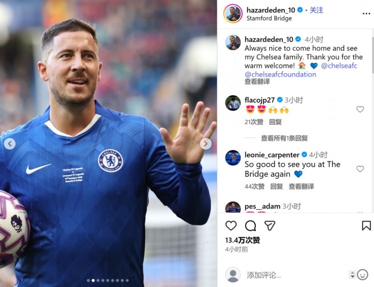 10月15日讯 切尔西名宿阿扎尔日前重返斯坦福桥参加了一场传奇赛,在社交媒体上,晒出了自己在斯坦福桥的照片并表达了自己的感激之情。 阿扎尔写道:回家并见到切尔西大家庭的成员总是很开心,感谢你们的热烈欢迎!